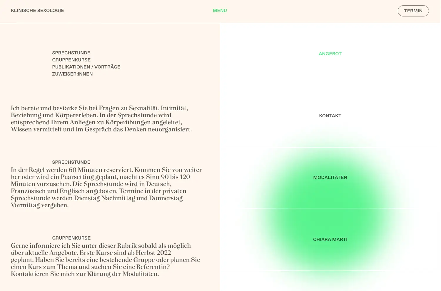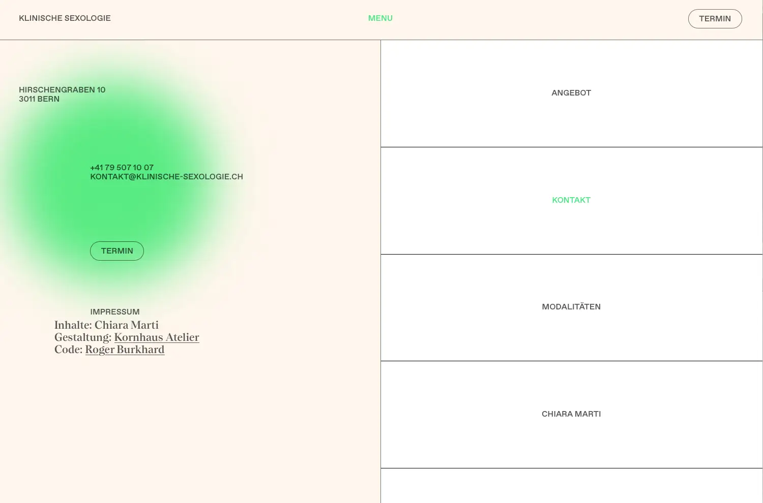 In Zusammenarbeit mit Kornhaus Atelier entwickelte ich die minimalistische Website, welche Häufige Fragen und Angebot auf interaktive Weise und einer Prise Humor vermittelt. Als Feature wurde ein invertierter Cursor entwickelt, welcher die Mausbewegung spiegelt und auf Klicks reagiert. Die Website basiert auf WordPress und lässt Chiara die Inhalte selbständig verwalten.