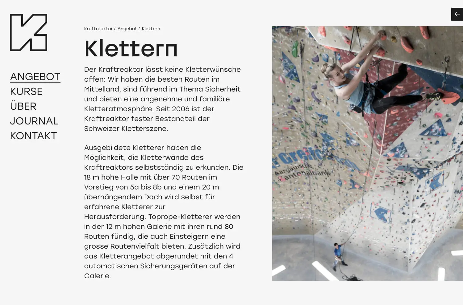 Der Kraftreaktor gilt als der Treffpunkt der Kletterszene im Aargau. Die eindrückliche 18 Meter hohe Halle bietet rund 70 Routen und das 20 Meter überhängende Dach bringt selbst das Adrenalin von erfahrenen Klettern zum kochen! Eine grosse Boulder-Halle, Kletter-Kurse und ein Café runden das Angebot ab. Seit der Eröffnung vor rund 22 Jahren konnte eine treue Stamm-Kundschaft aufgebaut werden und täglich wird Anfängern die Freude und Sicherheit am Seil von leidenschaftlichen Klettern vermittelt.