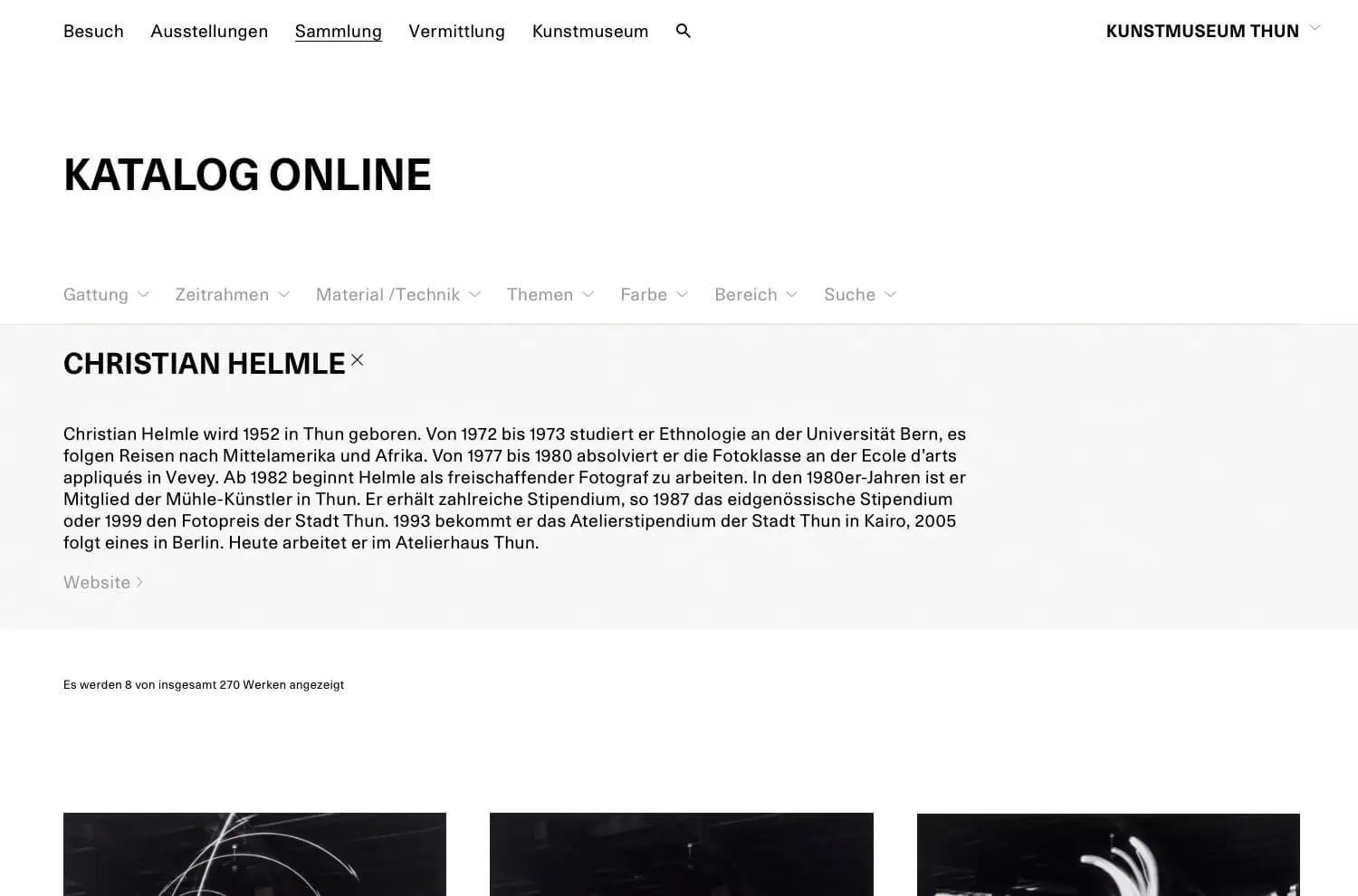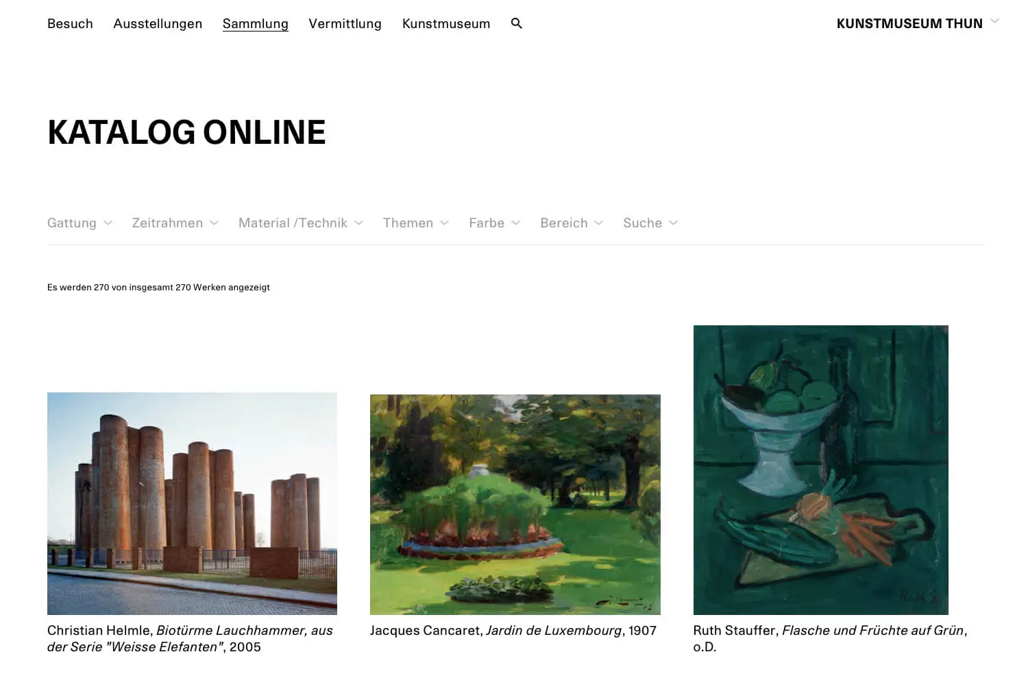 In Kollaboration mit dem Berner Grafiker Duo Bonsma & Reist entwickelte ich die neue Website des Museum. Das Herzstück der Website ist der Katalog Online welcher aus einer Schnittstelle zu der Software E-Museum Plus besteht, in welcher alle Werke des Museums verwaltet werden. Mit der Schnittstelle wurden nun erste Werke für die Öffentlichkeit sichtbar und erlebbar. Die Werke können nach ettlichen Attributen wie Farben, Epochen und Themen entdeckt werden. Viele Werke haben zudem audiovisuelle Inhalte und Texte wurden in Leichter Sprache erfasst.