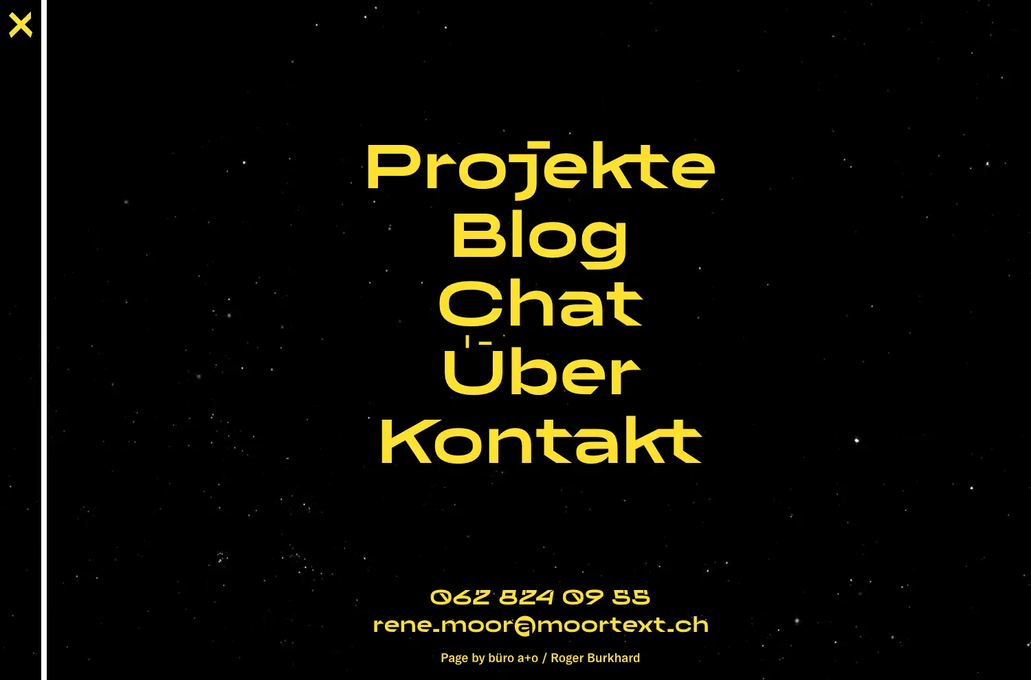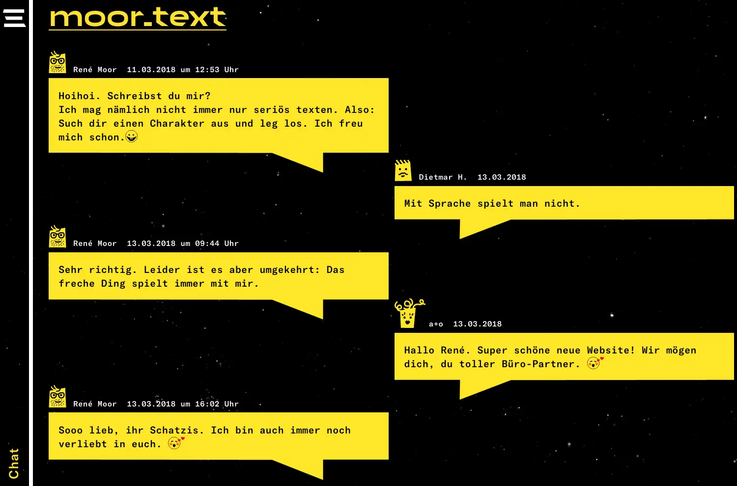 Auf der Startseite sieht man eine Anordnung seiner aktuellen Lieblingssätze – sozusagen sein Gesamtkunstwerk, welches eine Geschichte erzählt, und zwar in Fragmenten. Klickt man auf ein Projekt erhält man die nötigen Zusatz-Infos, welche Arbeiten geleistet wurden und Bilder können, ganz im Sinne der 90er, gestapelt weggeklickt werden. Neben einer About und Kontakt Seite, sowie einem Blog ist das Highlight sicherlich der Chat. Denn hier kann nicht nur mit René Kontakt aufgenommen werden – es finden auch milde Wortgefechte und krasse Liebesbotschaften zwischen dem Publikum und dem Texter René Moor ihren Platz. Viel Spass beim stöbern.