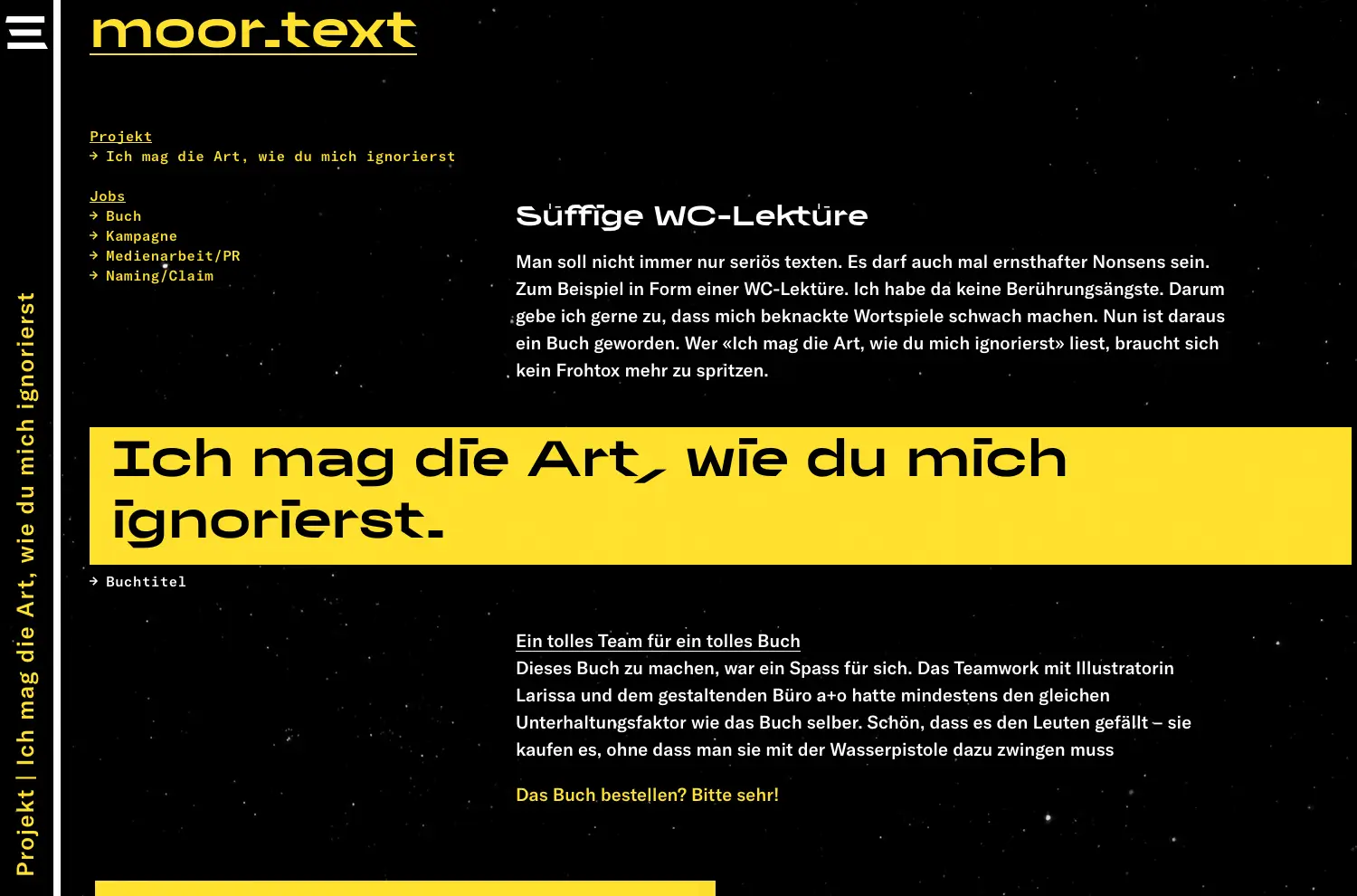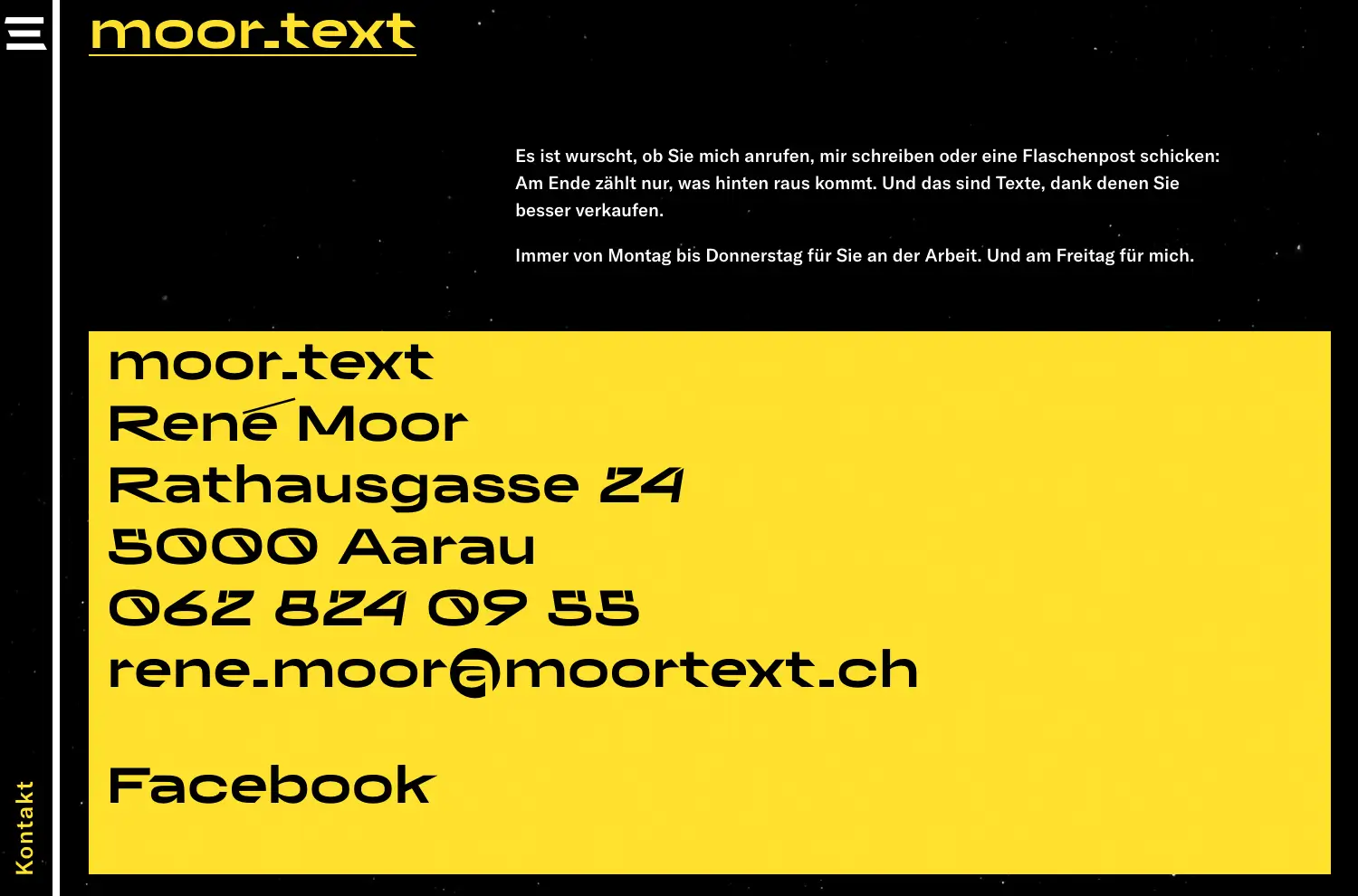 In Zusammenarbeit mit dem Grafik-Atelier Büro A+O tüftelten wir lange an Ideen, wie man die geleistete Arbeit eines Texters – nämlich Sätze und Wörter, Namen, Ideen + Konzepte in ein sinnvolles Format für ein Portfolio verpacken könnte. Die Seite sollte zum stöbern einladen, den 90er Groove und die Ursprünge des Texters René Moor übermitteln – auch sein Humor war ein tragendes Element während der ganzen Konzept-Phase. Entstanden ist eine Portfolio Seite der etwas anderen Art – und das ist gut so.
