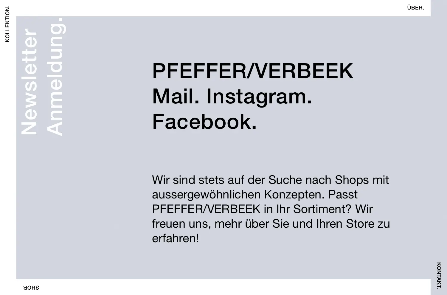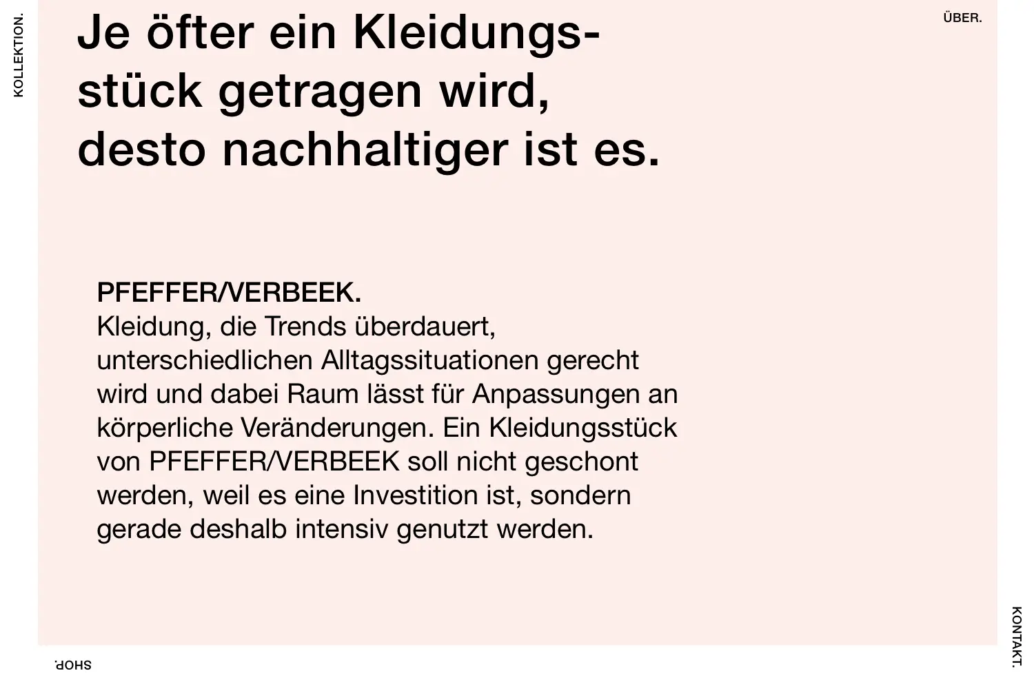 In Kollaboration mit der Berner Grafikerin Pia Fleischmann entwickelte ich die neue Website für das Modelabel. Basierend auf dem Konezpt von Pfeffer/Verbeek sollte die Website modular aufgebaut sein. Neue Kollektionen benötigen keine Neuprammierung der Website, sondern Farben können nach Kollektion angepasst werden, neue Kollektion und Stücke einfach via WordPress hinzugefügt werden.