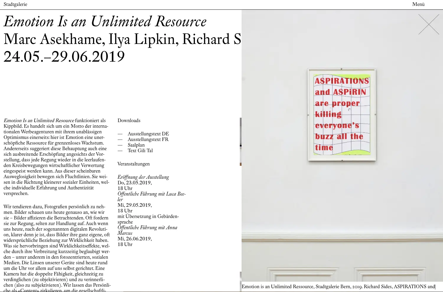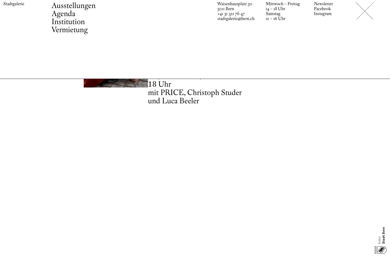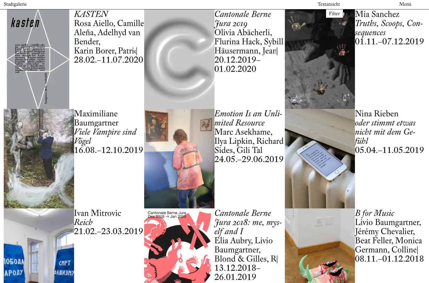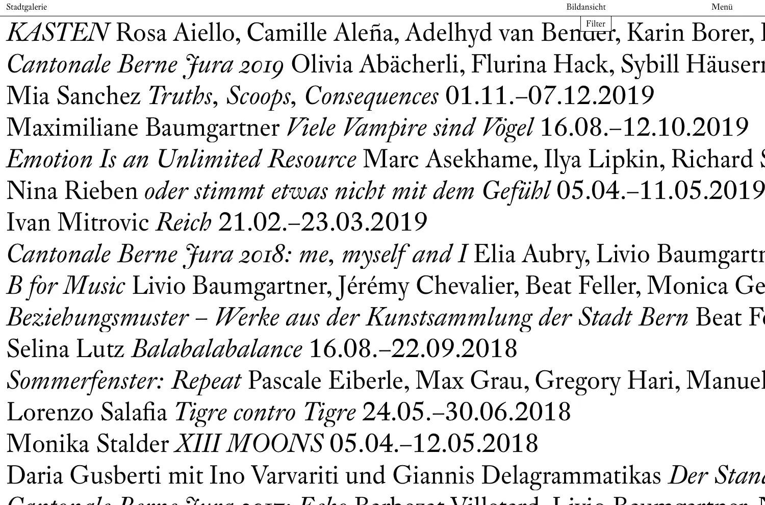 In Kollaboration mit dem Grafiker-Duo Kornhaus Atelier durfte ich neue Website der Galerie entwickeln. Mit einer skalierbaren Typografie, viel Weissraum, Überlagerungen und einem klaren Regelwerk von Stilvorlagen wirkt die Website zeitlos und ästhetisch. Doch die Seite kann sich auch unter der Haube sehen lassen: der Kurator kann jeweils selbständig Ausstellungen und Veranstaltungen erfassen, diese simpel miteinander verknüpfen, eine Weiterlesen Funktion hinzufügen, archivieren und dokumentieren und dies zweisprachig mit Synchron-Funktion gewisser Inhalte. Ausstellungen wurden bis 2009 erfasst um das umfassende Archiv der Stadtgalerie sichtbar zu machen.