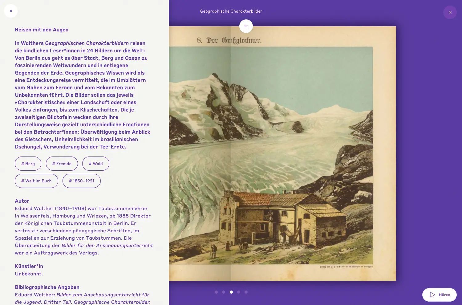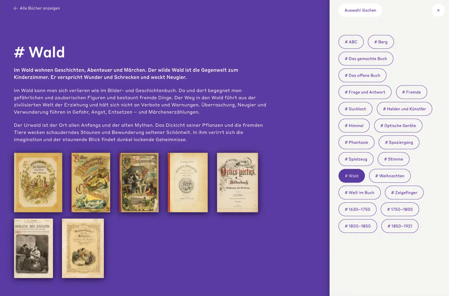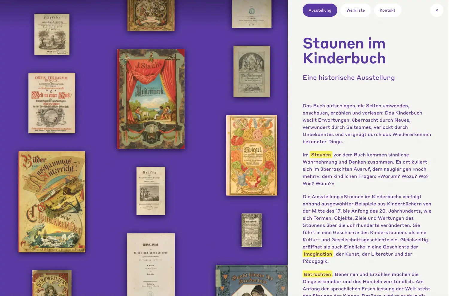 Die Online-Ausstellung «Staunen im Kinderbuch» verfolgt anhand ausgewählter Beispiele aus Kinderbüchern von der Mitte des 17. bis Anfang des 20. Jahrhunderts, wie sich Formen, Objekte, Ziele und Wertungen des Staunens über die Jahrhunderte veränderten. Sie führt in eine Geschichte des Kinderstaunens als eine Kultur- und Gesellschaftsgeschichte ein. Gleichzeitig eröffnet sie auch Einblicke in eine Geschichte der Imagination, der Kunst, der Literatur und der Pädagogik.