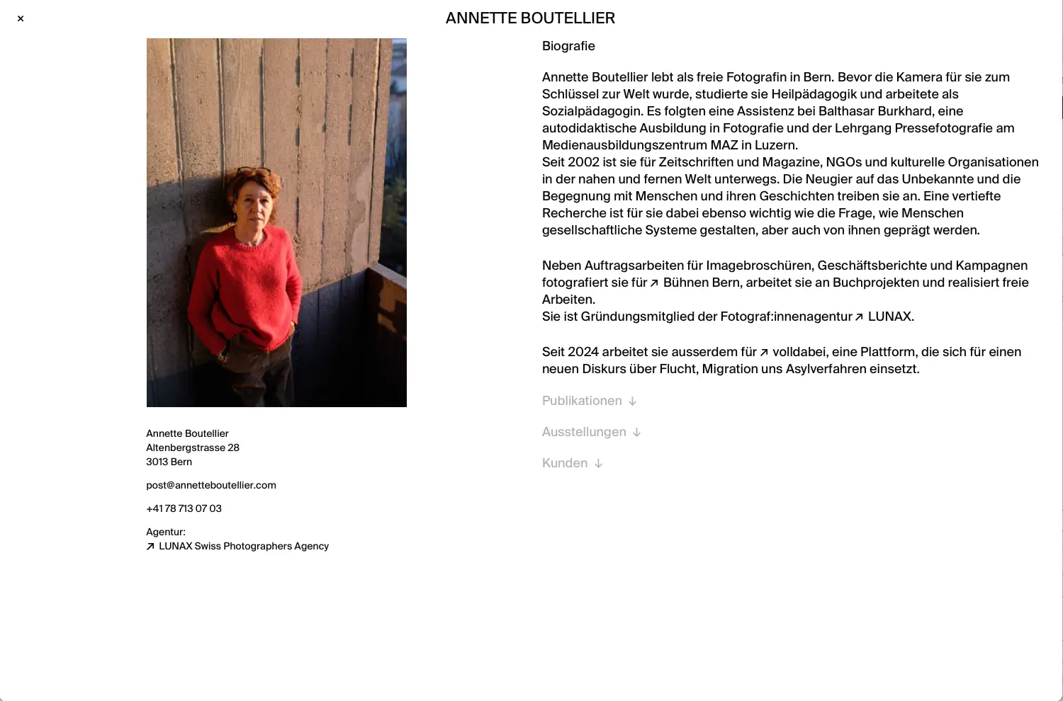 Annette Boutellier is a freelance photographer based in Bern. Since 2002 she has been travelling the world, near and far, for magazines and journals, NGOs and cultural organisations. She is driven by curiosity about the unknown and encounters with people and their stories.