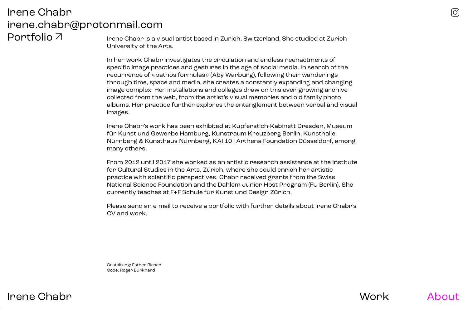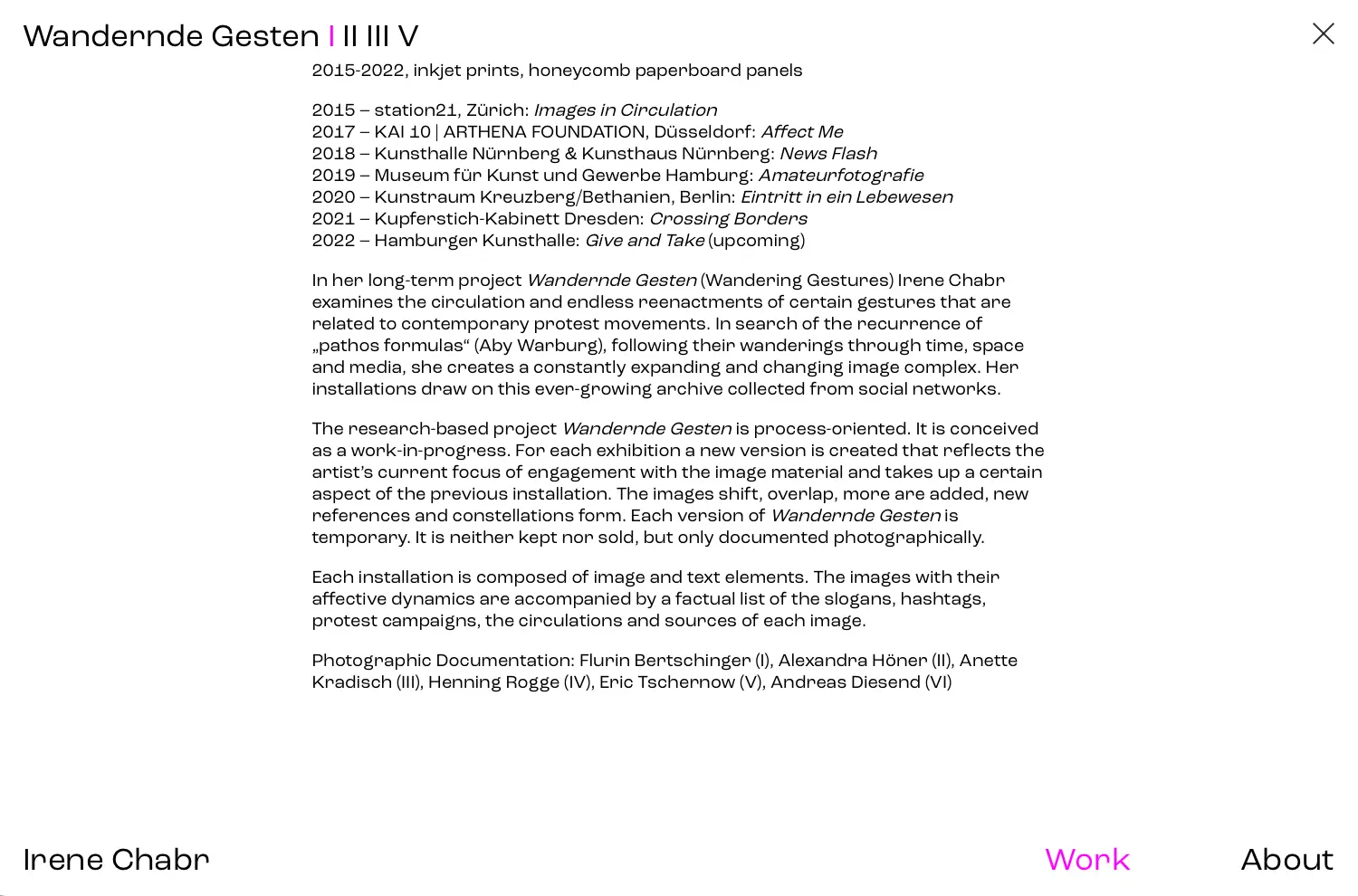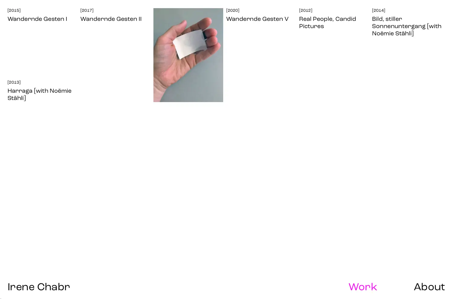 In collaboration with Zurich-based graphic designer Esther Rieser, I developed the new website for Chabr. Images are stacked on top of each other via scroll and thus also achieve the effect of endless repetition. Based on WordPress, the artist can manage projects independently.