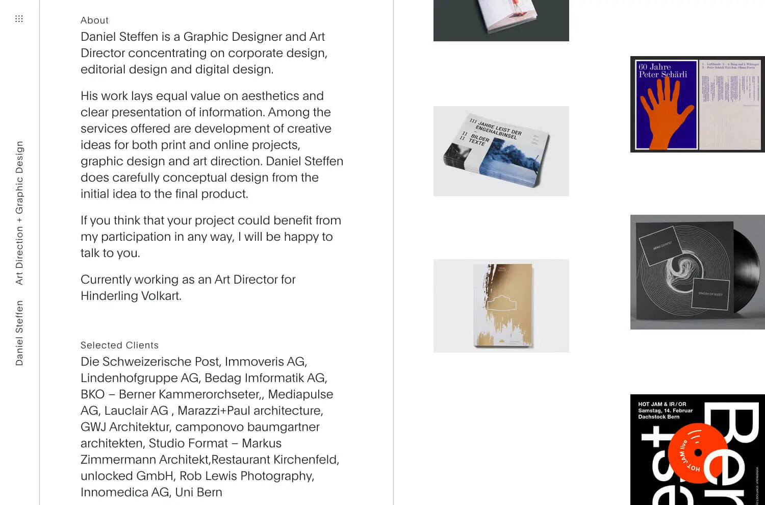 For the Swiss graphic designer and art director Daniel Steffen I was allowed to realise the new One Page App Porftolio website. The website is minimalist and allows you to browse quickly and seamlessly through the various works. In the background is the WordPress CMS, which allows Daniel to easily and intuitively enter projects and sort and edit them using drag and drop.