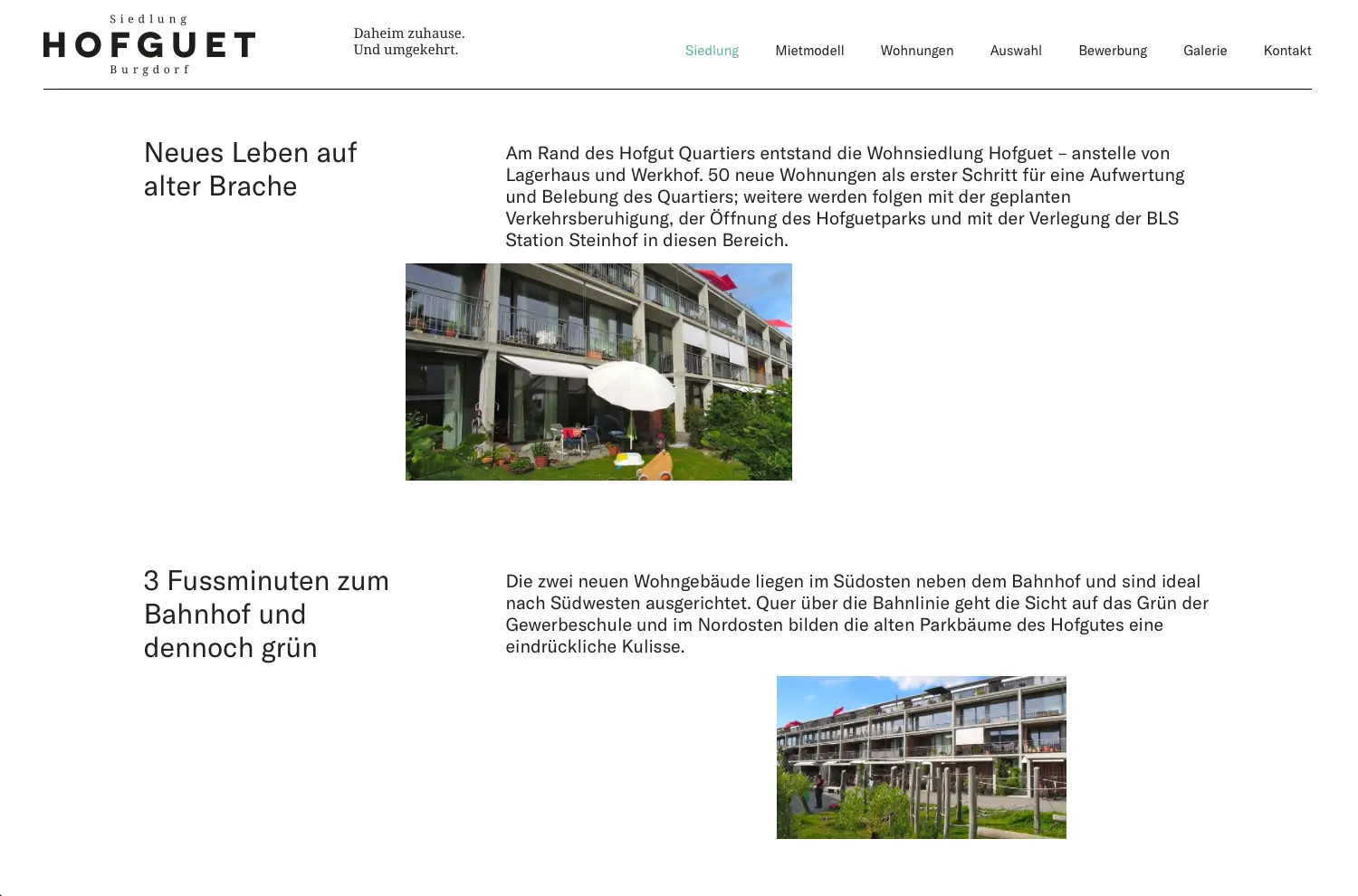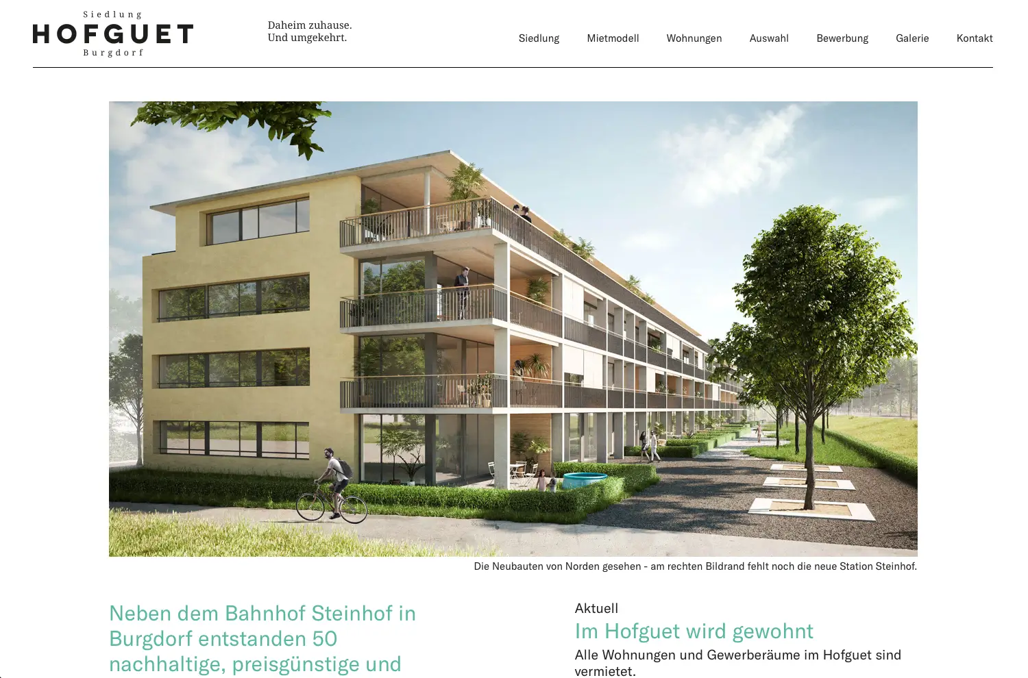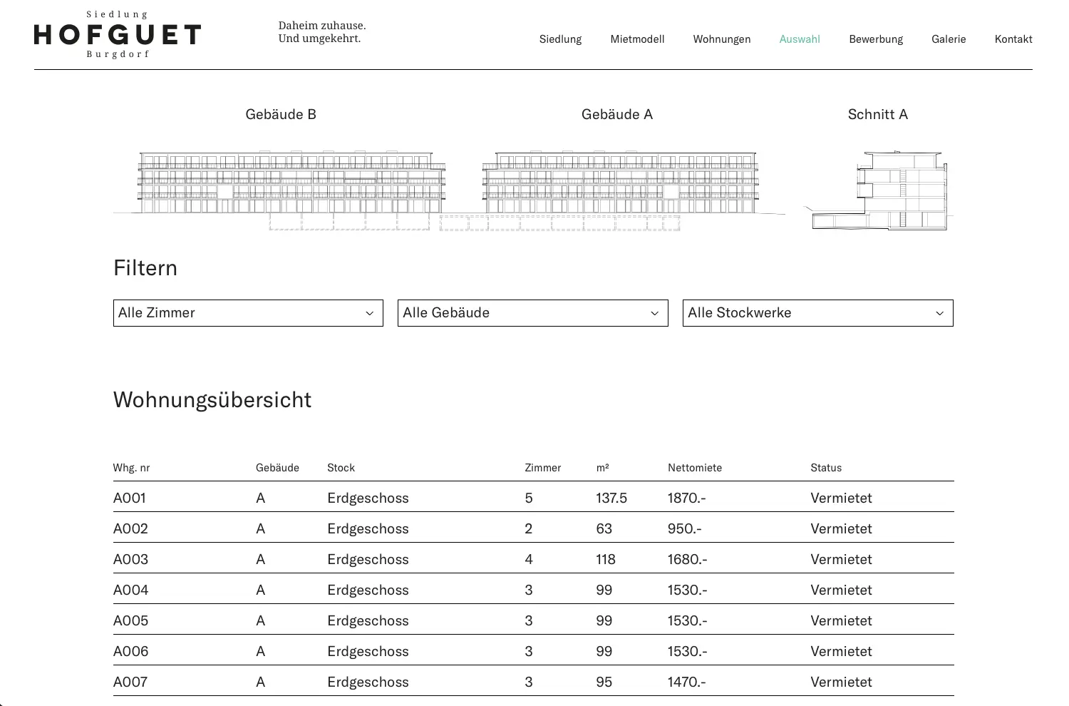 In collaboration with the graphic design studio Heyday, I developed the website for the housing estate. On the one hand, there is content about the flats, but the centrepiece is an interactive tool for selecting the flats and the corresponding view in cross-section.