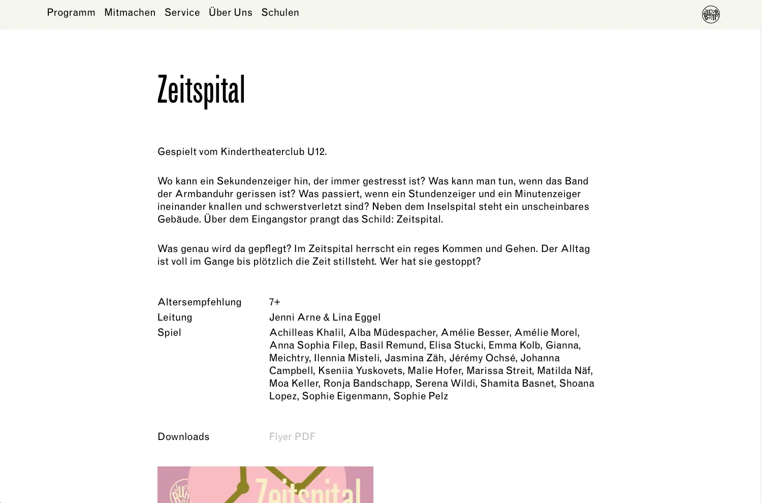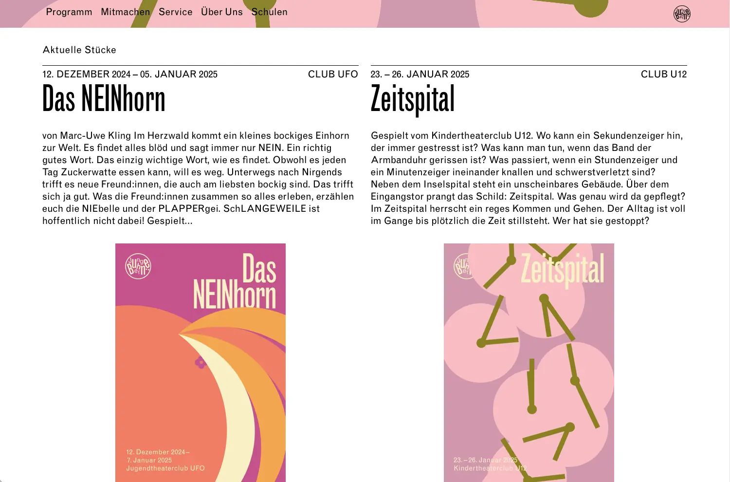 In close collaboration with the graphic design studio B&R, which has been designing the theatre’s posters since 2011, I was able to implement the new website. The aim was to merge the site with the six-monthly, beautifully designed programme booklet. I developed a web framework based on JavaScript and HTML5 to bring the colours, graphics and animation of the print into the digital world. As the target group is both children and adults, the site had to have a playful character and so we invested a lot of time in experiments, interaction design and effects. In addition to design and interaction, a large part of the work also involved simplifying and digitalising the processes. For example, I developed a customised reservation tool that not only gives guests the opportunity to make a reservation outside of office hours, but also simplifies admission and checkout for employees.