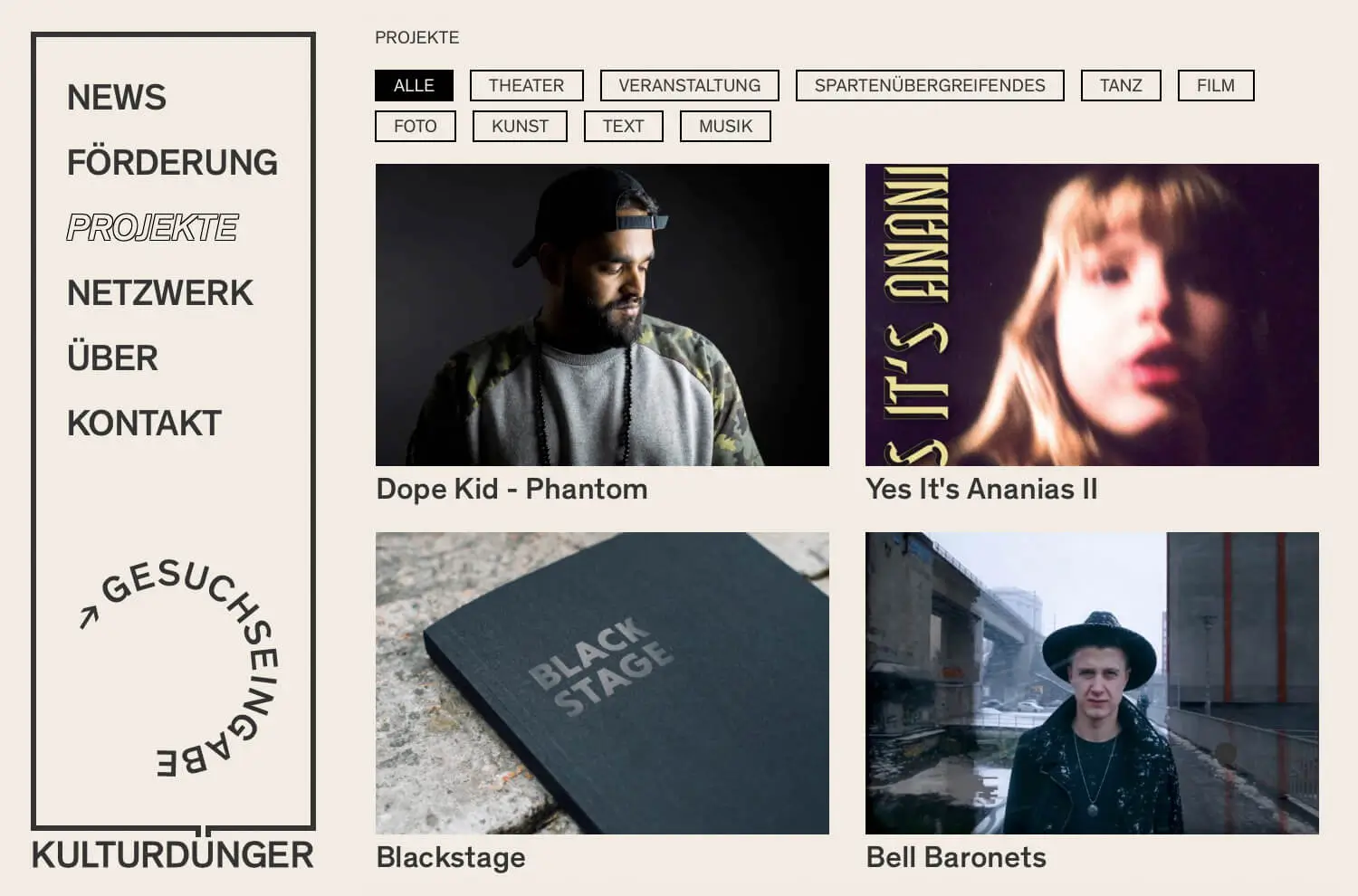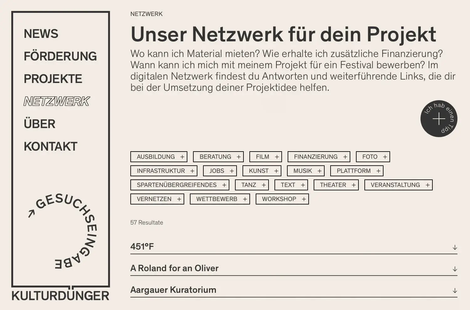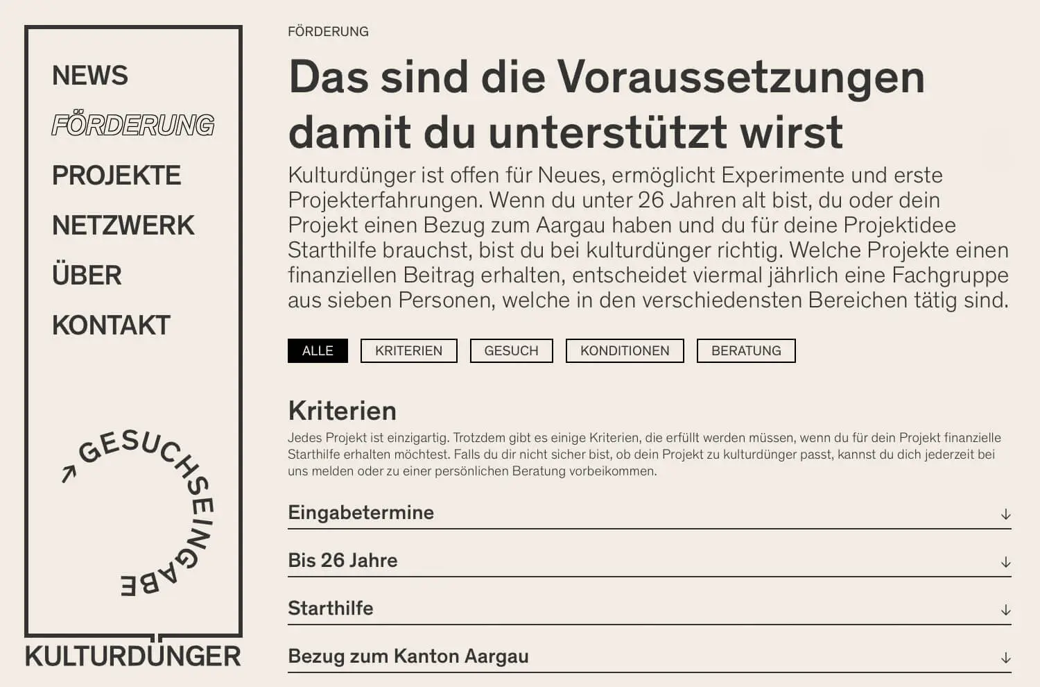 I was able to develop the new website in collaboration with Büro a+o. Always open to new ideas and in the spirit of digital nomadism, we developed some of the functionalities and designs together in an alpine hut in the Bernese Oberland. And the result is impressive: playful elements and animations, large typography and an unusual navigation concept are intended to encourage teens and tweens up to the age of 26 to submit their cultural projects and browse through the previous projects.
