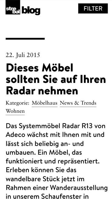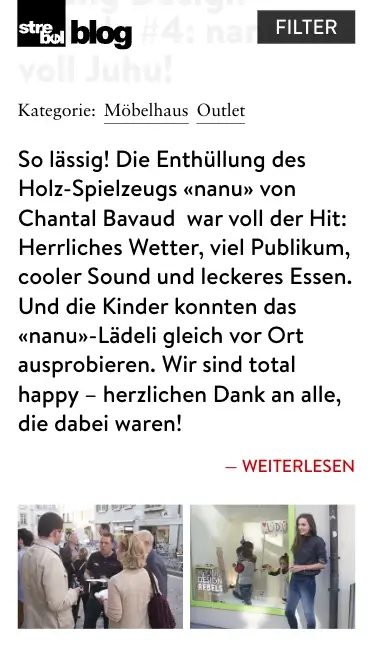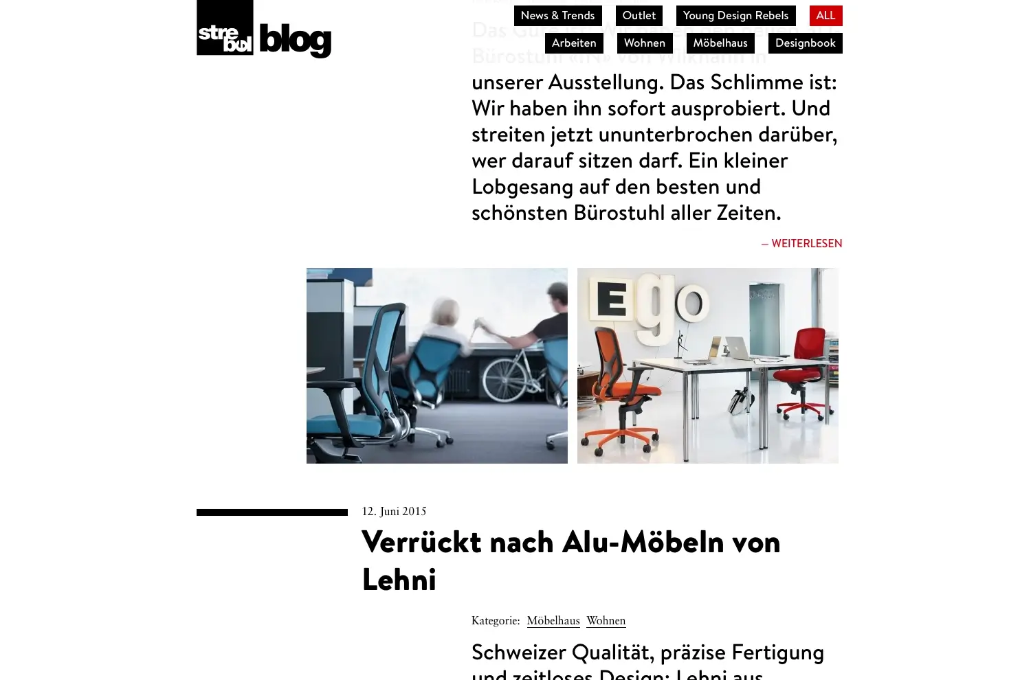 In collaboration with Büro A+O, I developed the new blog for the furniture store Strebel. The innovative shop wanted a digital platform to report on current furniture trends, but also to introduce the young designers and artists they support, aka Young Design Rebels.