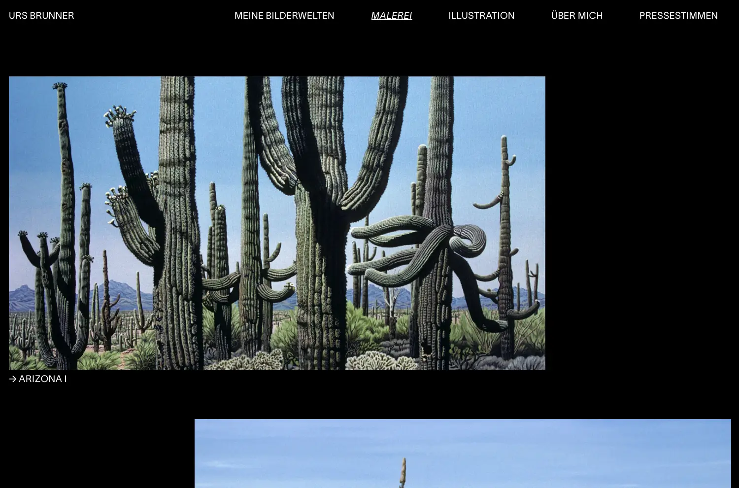 Zu den grossen Passionen des 77 Jährigen Berner Malers und Illustrators Urs Brunner gehört das Gerätetauchen im Mittelmeer und den tropischen Korallenmeeren. Wiederholte Begegnungen mit der Arizona-Sonora-Wüste im Südwesten der USA üben ebenfalls eine gewaltige Faszination auf den Künstler aus. Beide Lebensräume beinhalten einerseits essentielle Schlüsselerlebnisse, andererseits auch Motivation für die Entwicklung seiner Bilderwelten im künstlerischen Schaffen. Seine Arbeiten welche stilistisch dem Hyper- bzw. Fotorealismus, aber auch dem Magischen Realismus zugeordnet werden können sind faszinierend und einmalig.