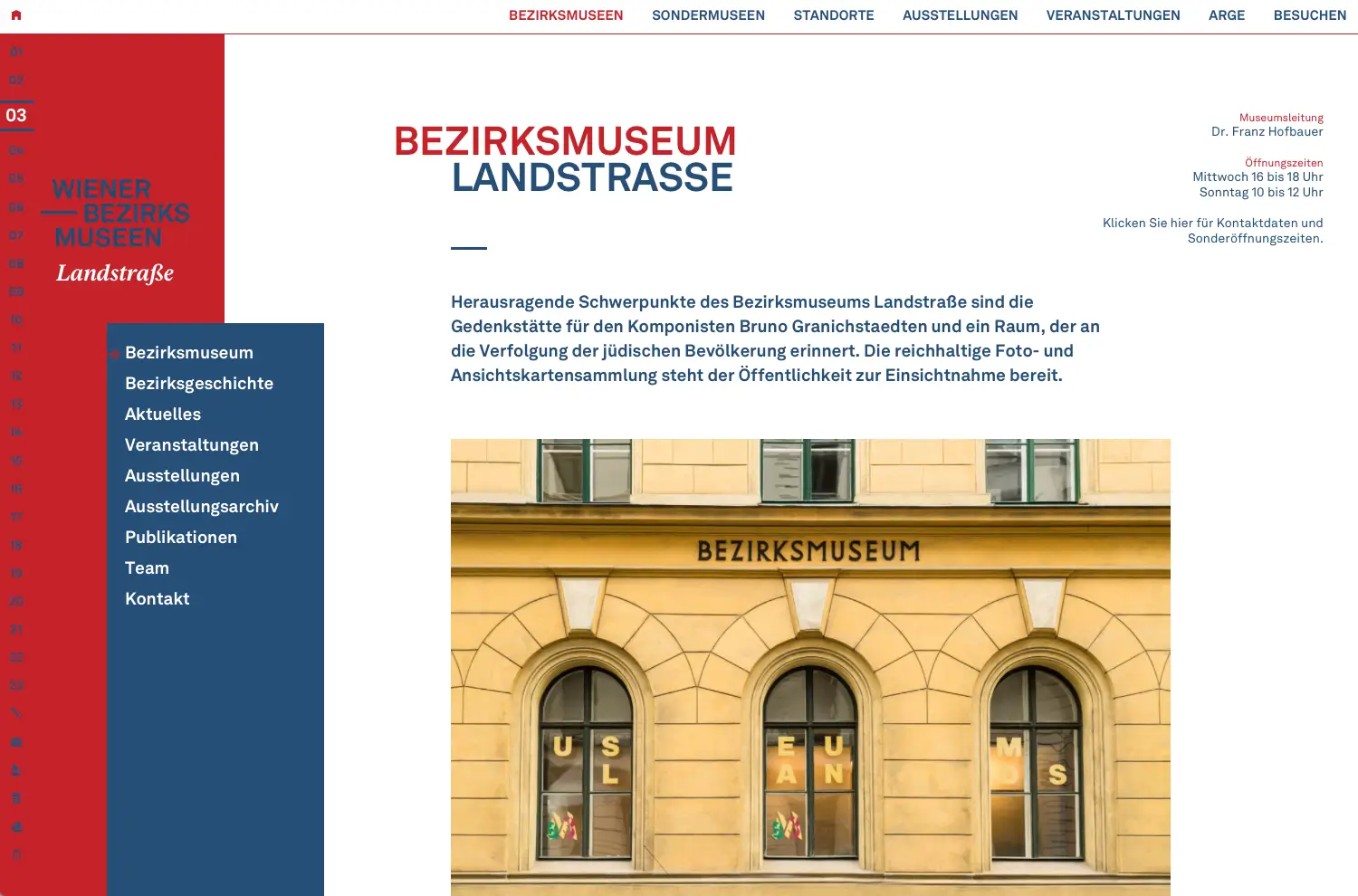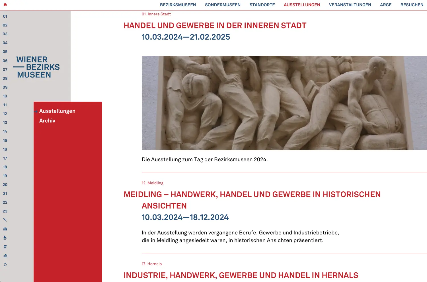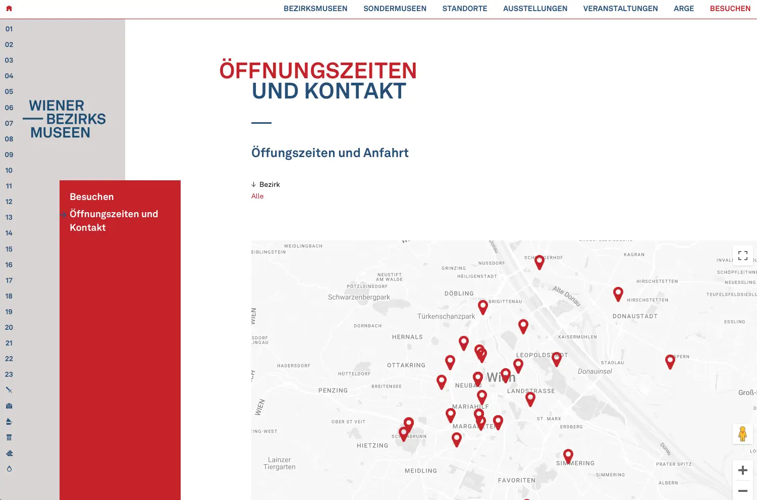 In collaboration with the Salzburg design studio Wir sind Artisten, I developed the new website for Vienna’s district museums. All museums have their own access to the backend and can thus manage their content and exhibitions independently. Additional content is edited via components and templates in WordPress.