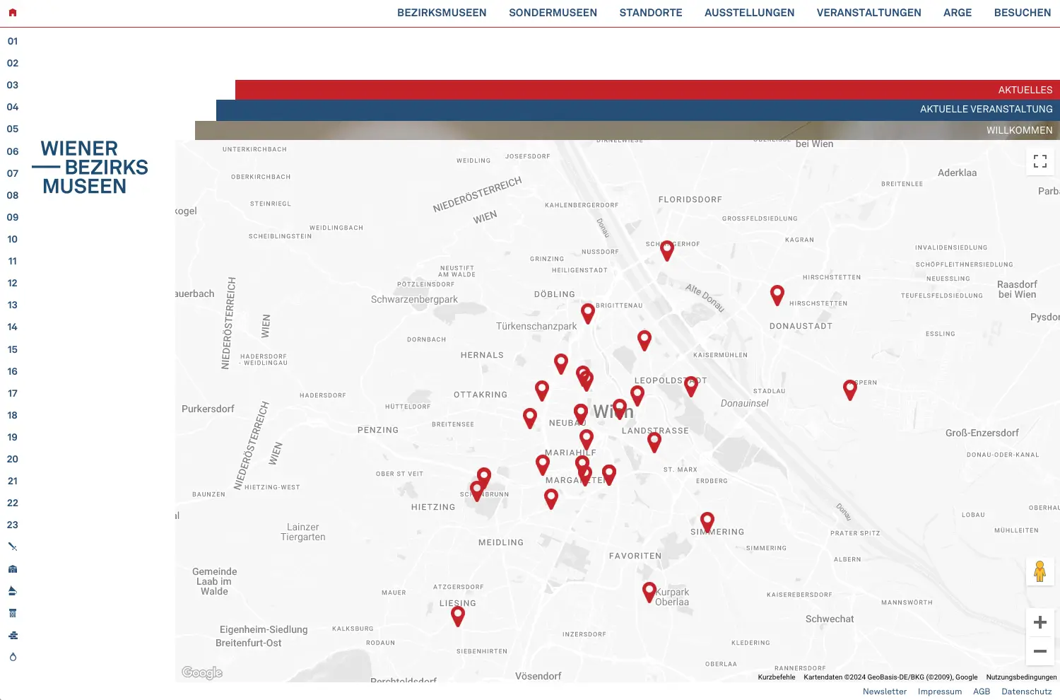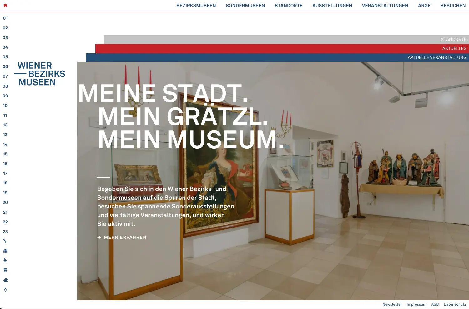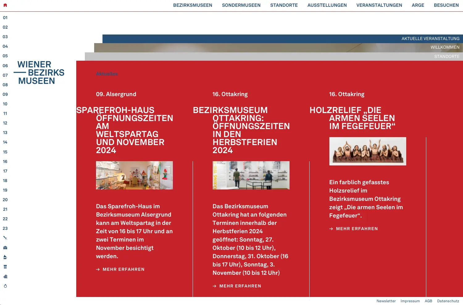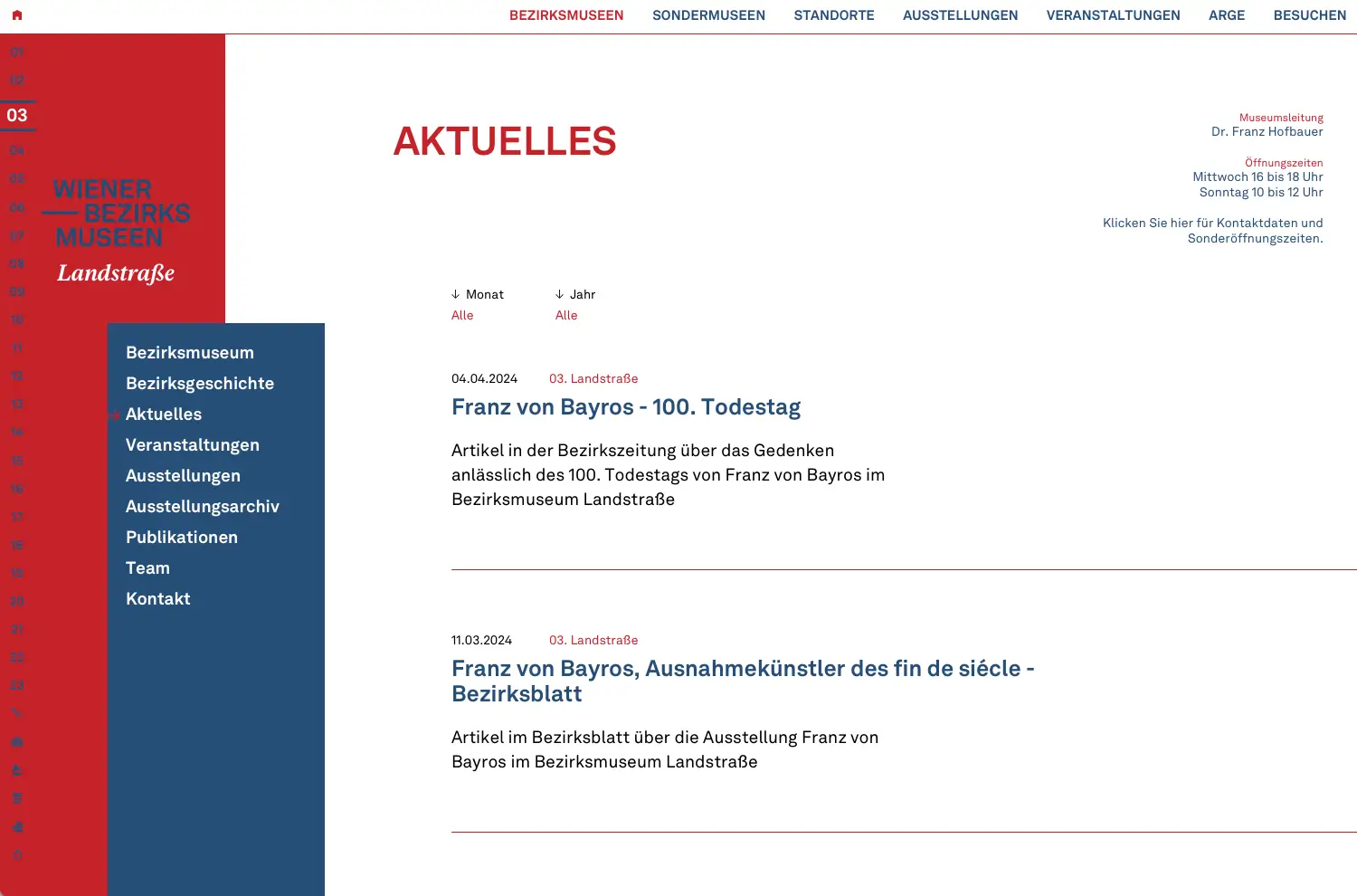 In collaboration with the Salzburg design studio Wir sind Artisten, I developed the new website for Vienna’s district museums. All museums have their own access to the backend and can thus manage their content and exhibitions independently. Additional content is edited via components and templates in WordPress.