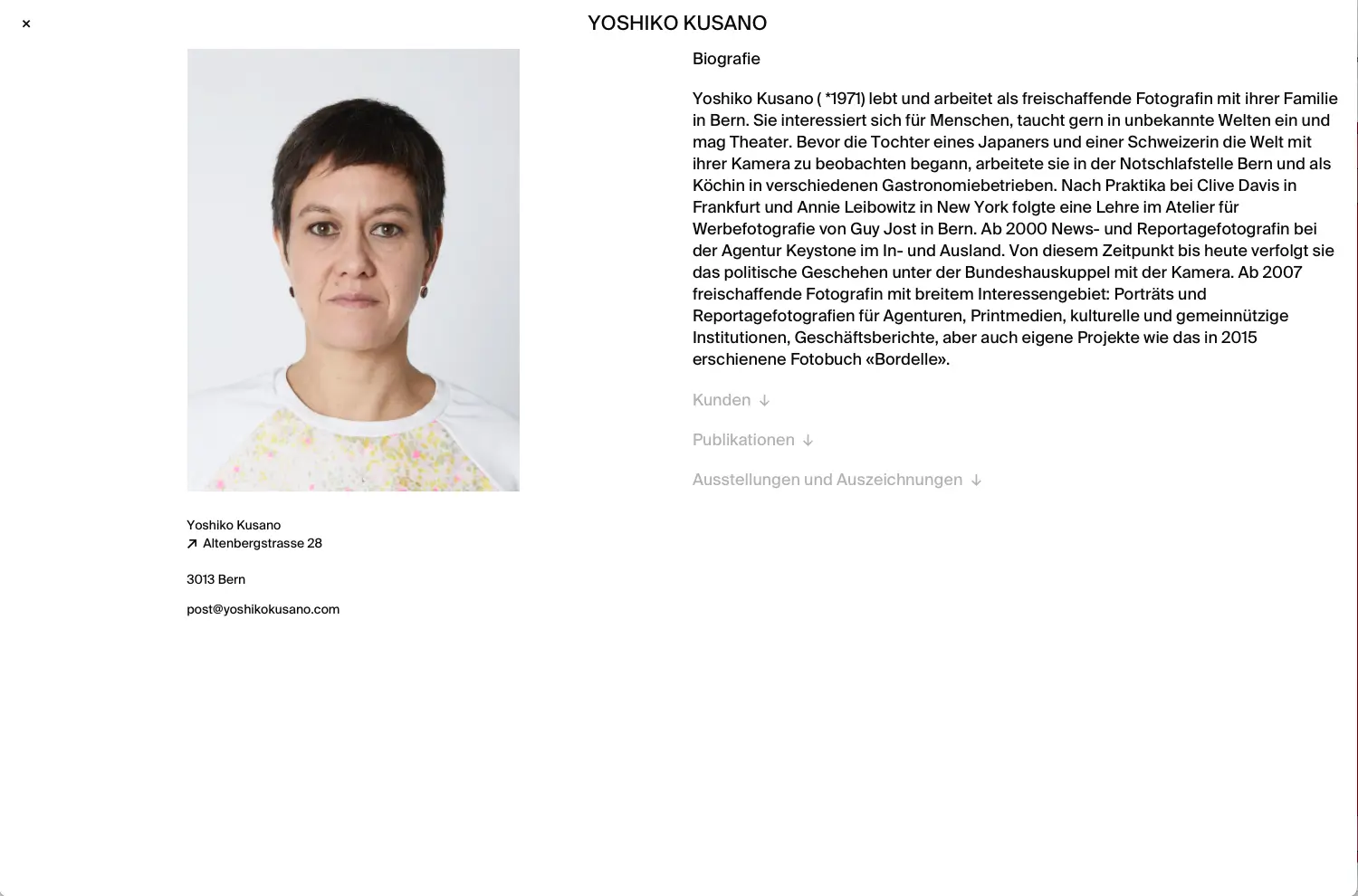 Yoshiko Kusano lives and works as a freelance photographer in Bern. She is interested in people, likes to immerse herself in unknown worlds and enjoys theatre. She has been a freelance photographer with a wide range of interests since 2007: her work is characterised by portraits and reportage photography for agencies, print media, cultural and non-profit institutions, annual reports, but also her own projects such as the photo book ‘Bordelle’ (Brothels) published in 2015.